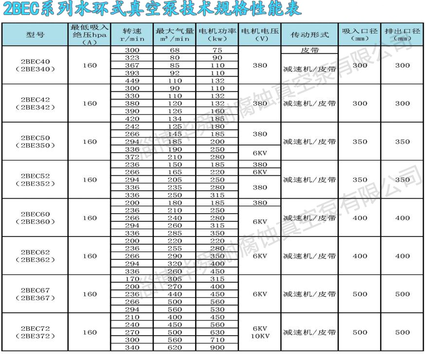 1、上列性能数据基于进气温度20%,进水温度15℃,排气压力1013hpa,吸入介质为饱和空气的条件。